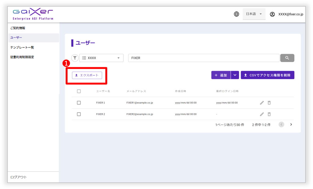 Admin Portal内ユーザー一覧より、登録されているユーザーをまとめてCSVファイルに出力することができます。