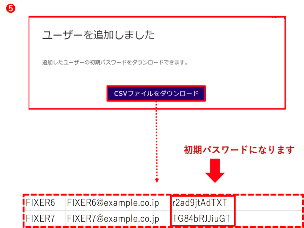 「CSVファイルをダウンロード」ボタンを押下すると、登録したユーザーの情報と初期パスワードが