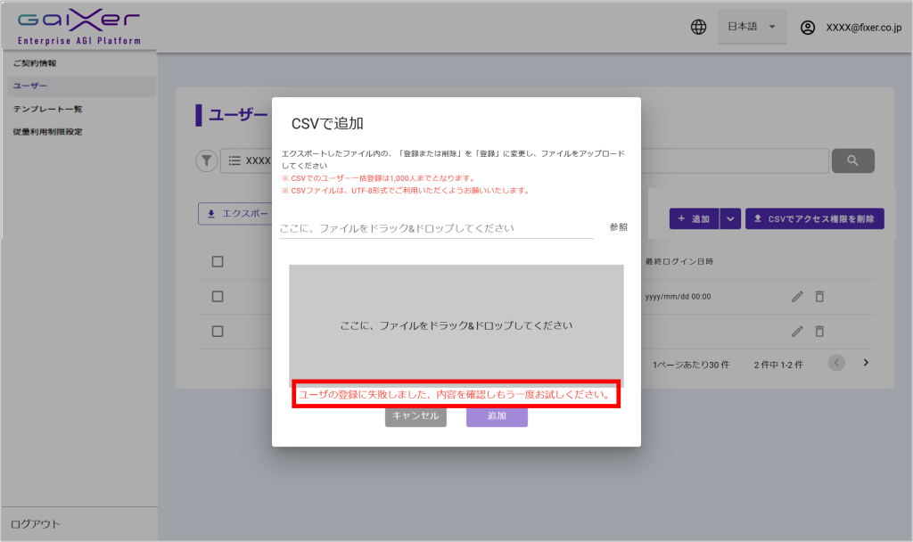 7.「CSVで追加」画面にCSVファイルをドラッグ&ドロップします。