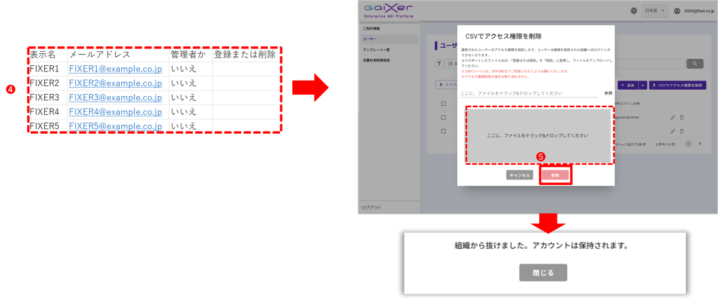 3.CSVファイルには「表示名」「メールアドレス」「管理者か」「登録または削除」の情報が