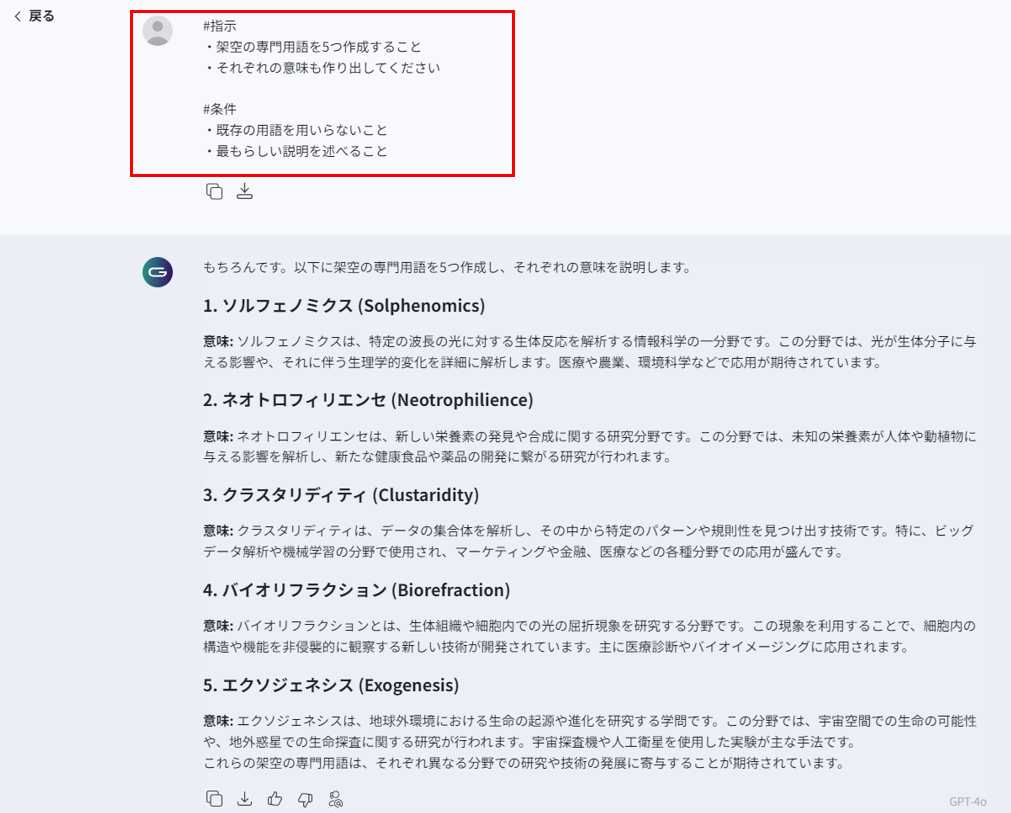 最後はGaiXerの学習セット機能と併用して、「専門用語解説プロンプト」テンプレートを試してみましょう。まずは、GaiXerに架空の専門用語集を作成させます。