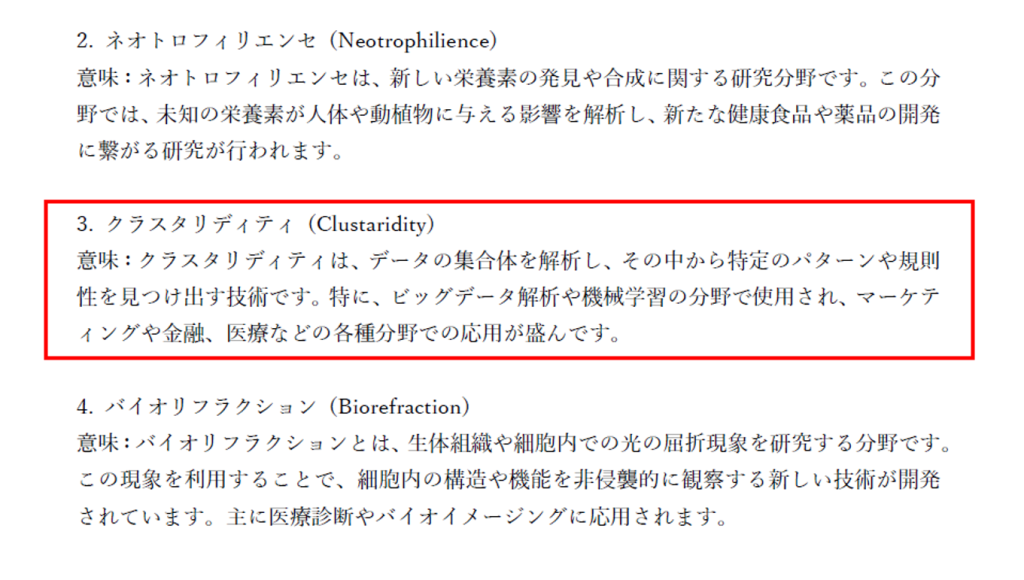 先ほど作成させた架空の専門用語集のうち、「クラスタリディティ (Clustaridity)」という用語を含んだ内容を文章にし、生成してみましょう。