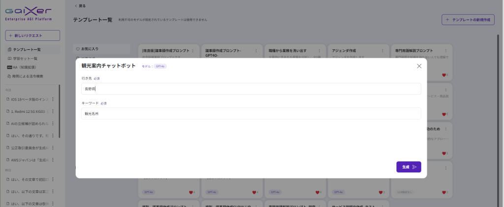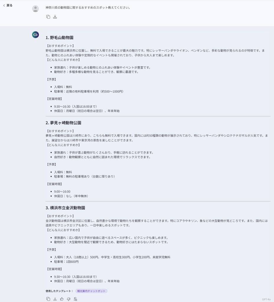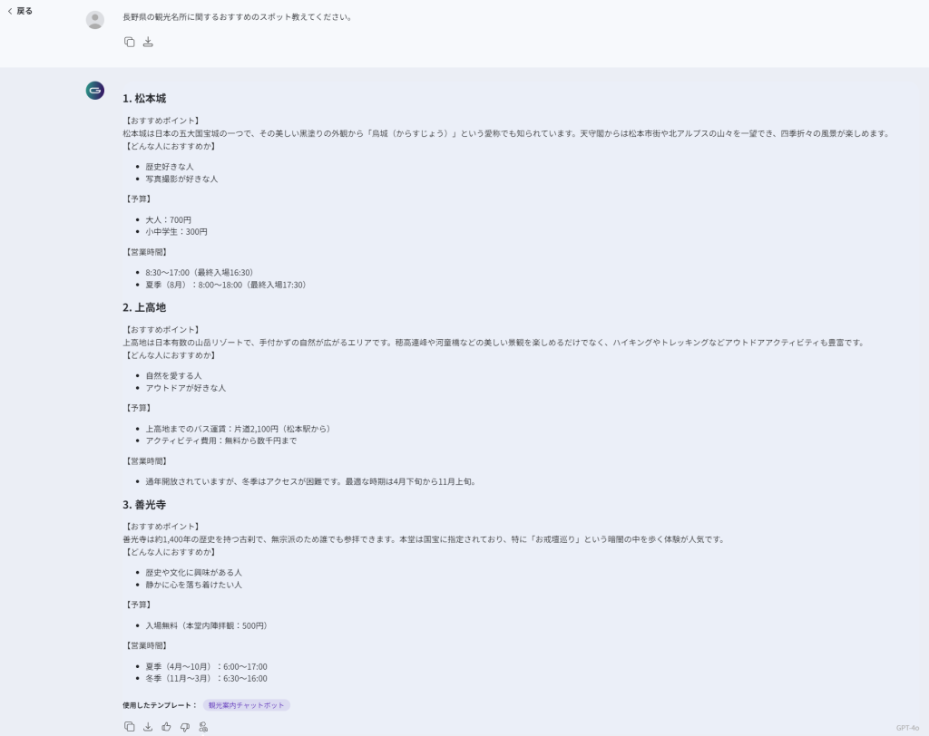 先ほどは「キーワード」に「観光名所」と入力しましたが、出力された情報を確認した後に、再度別の質問をすることができます。