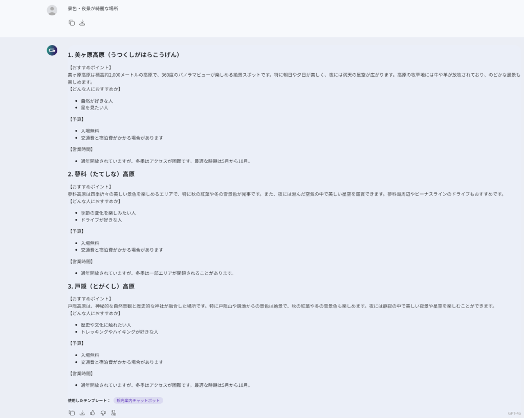 例えば、以下のように「景色・夜景が綺麗な場所」といった具体的な行き先を入力した際も、同様の形式で回答が生成されます。