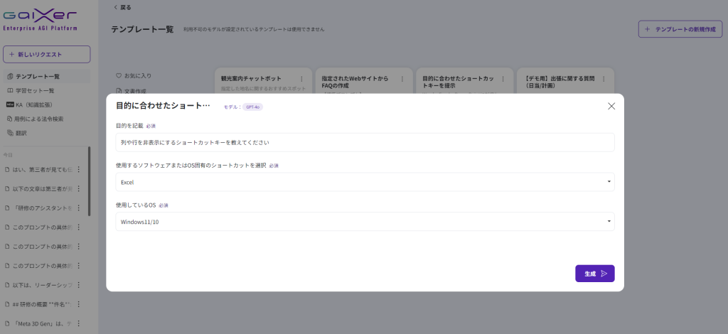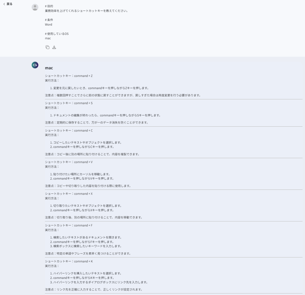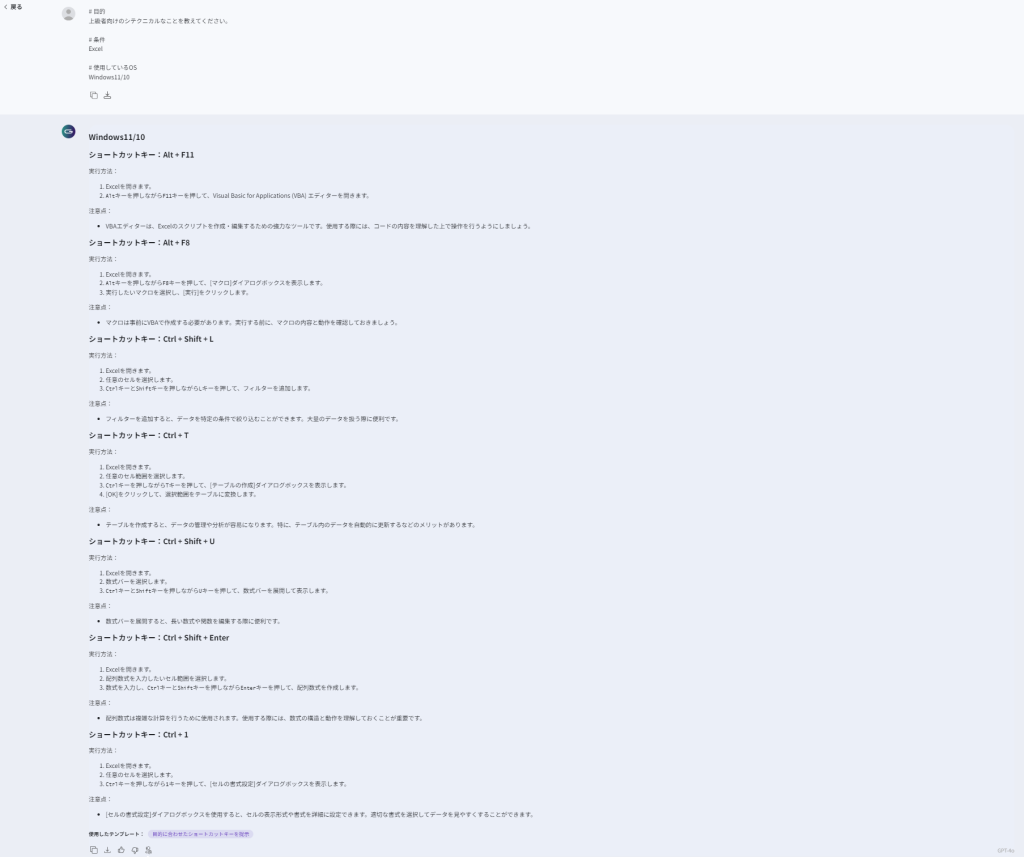 試しに以下のような「目的」を入力し生成させてみましたが、目的に合わせたショートカットキーが複数提示してくれました。
