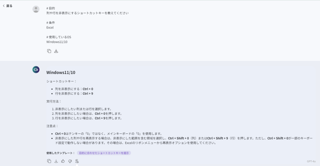 すると、このように指定した内容に合わせたショートカットキーを教えてくれました。