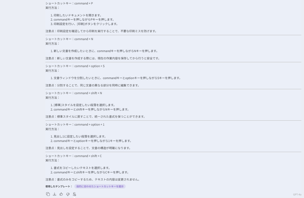 「目的に合わせたショートカットキーを提示」テンプレートを使用することで、目的に合わせたショートカットキーを教えてくれます。