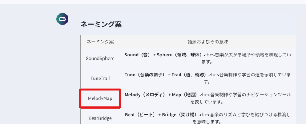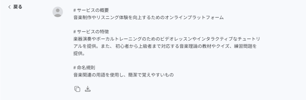 試しに、先ほど「ネーミング案の考案」テンプレートで提案された「MelodyMap」をサービスの名称として使用し、その他の情報も入力して、説明文を作成させました。