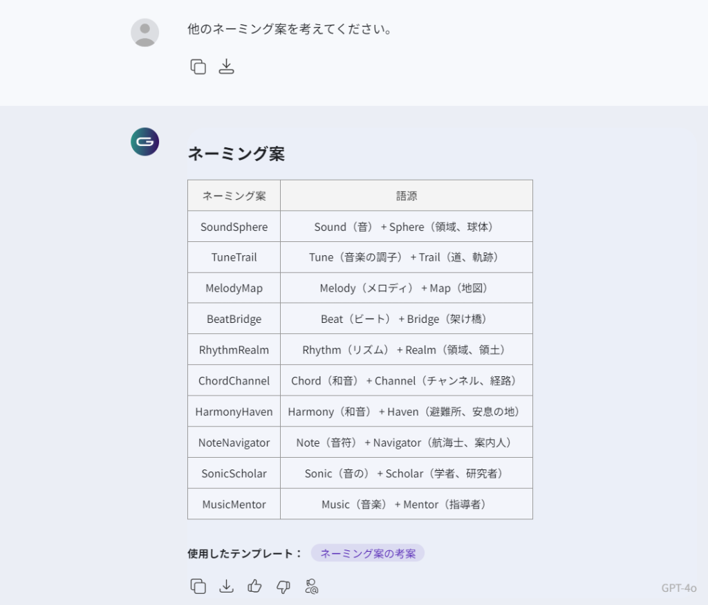 先ほど出力されたネーミング案以外のものを再度考えたい場合、同じリクエスト画面にてそのまま新たな案を考えてほしい旨を入力することで、同じフォーマットで再提案してくれます。