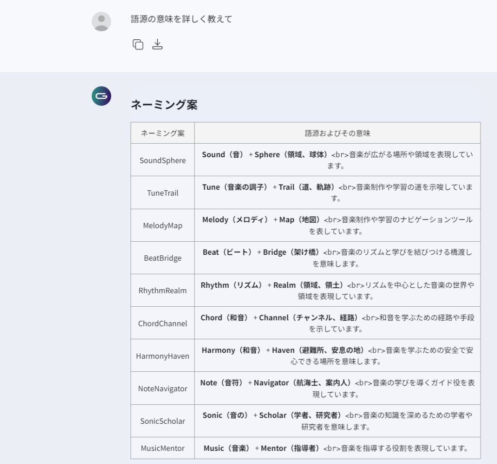 また、このように続けて語源の意味などを質問することで、出力項目を増やすこともできます。