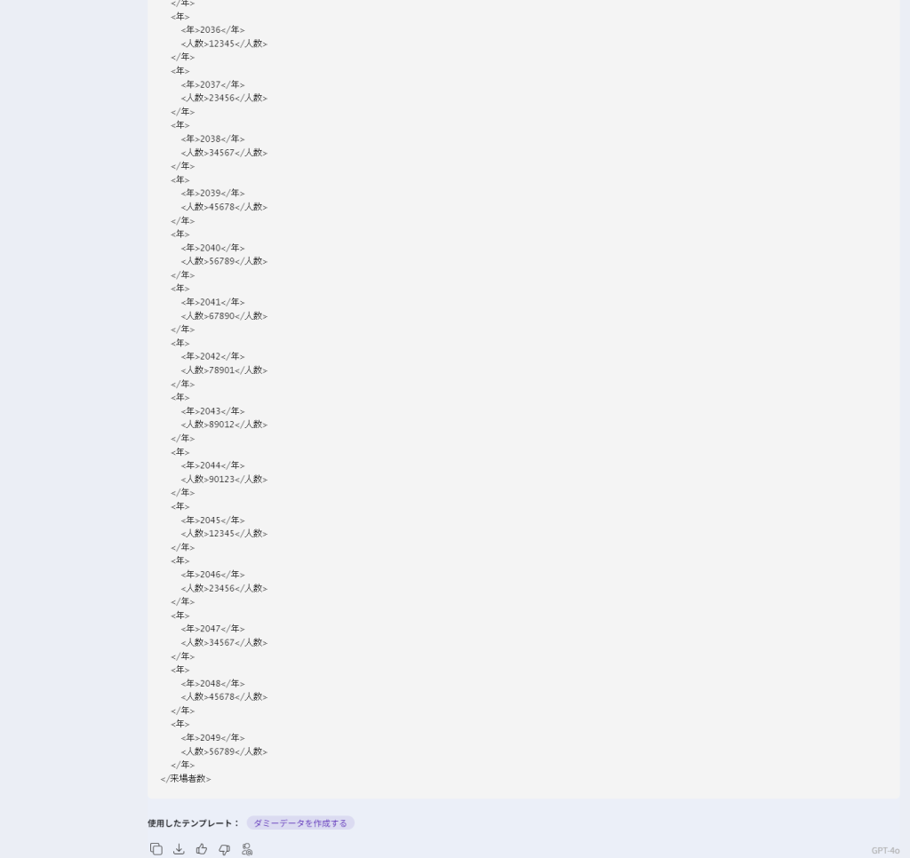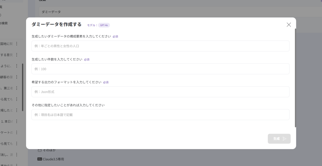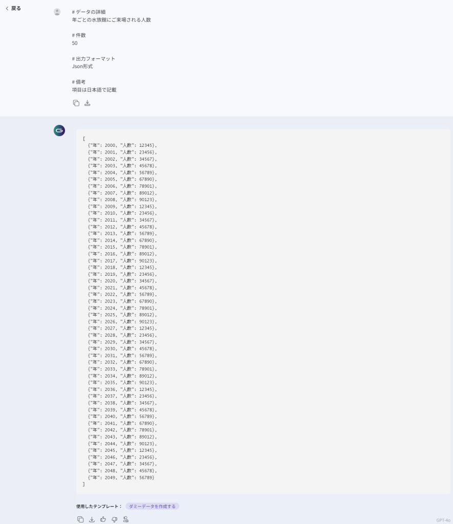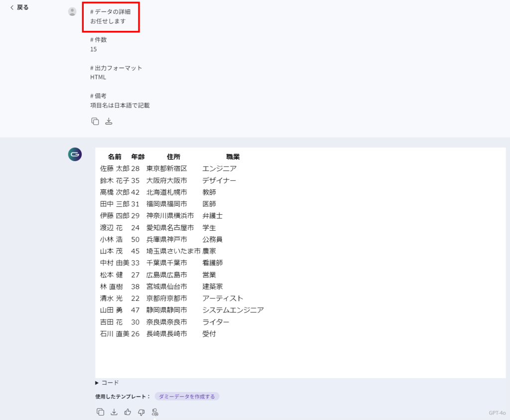 試しに、「データの詳細」の項目に「お任せします」と入力しましたが、このように特定の指定がなくても、ダミーデータを出力してくれました。