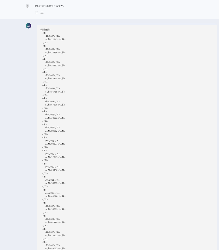 今回は「XML形式で出力できますか」という内容を入力したところ、XML形式で再度出力してくれました。