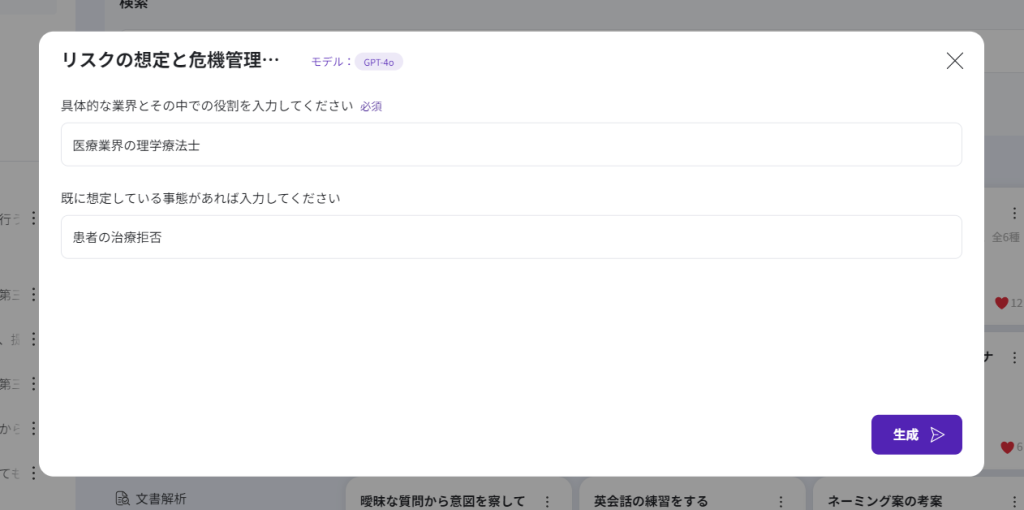生成を受けて、懸念事項など同じ生成画面にて入力することができます。