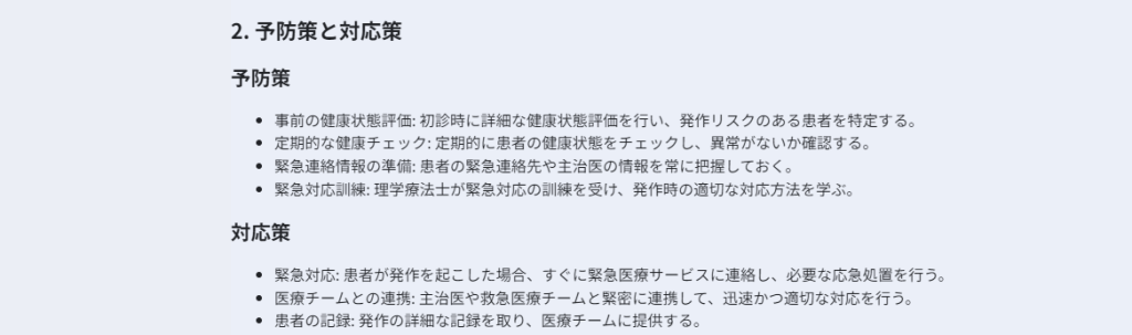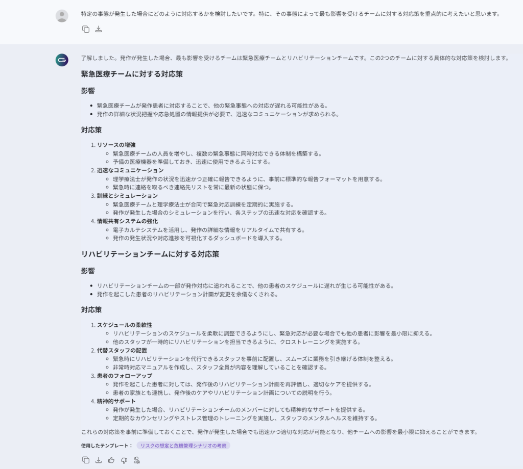 1で上げた「新たな事態」に対する予防策と、もし発生した場合の対応策を出力します。