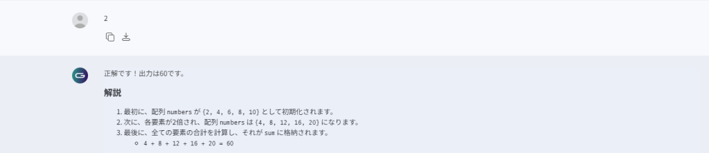 回答すると、解答と解説が出力されます。