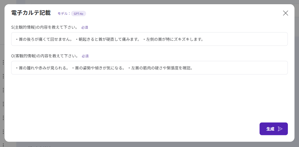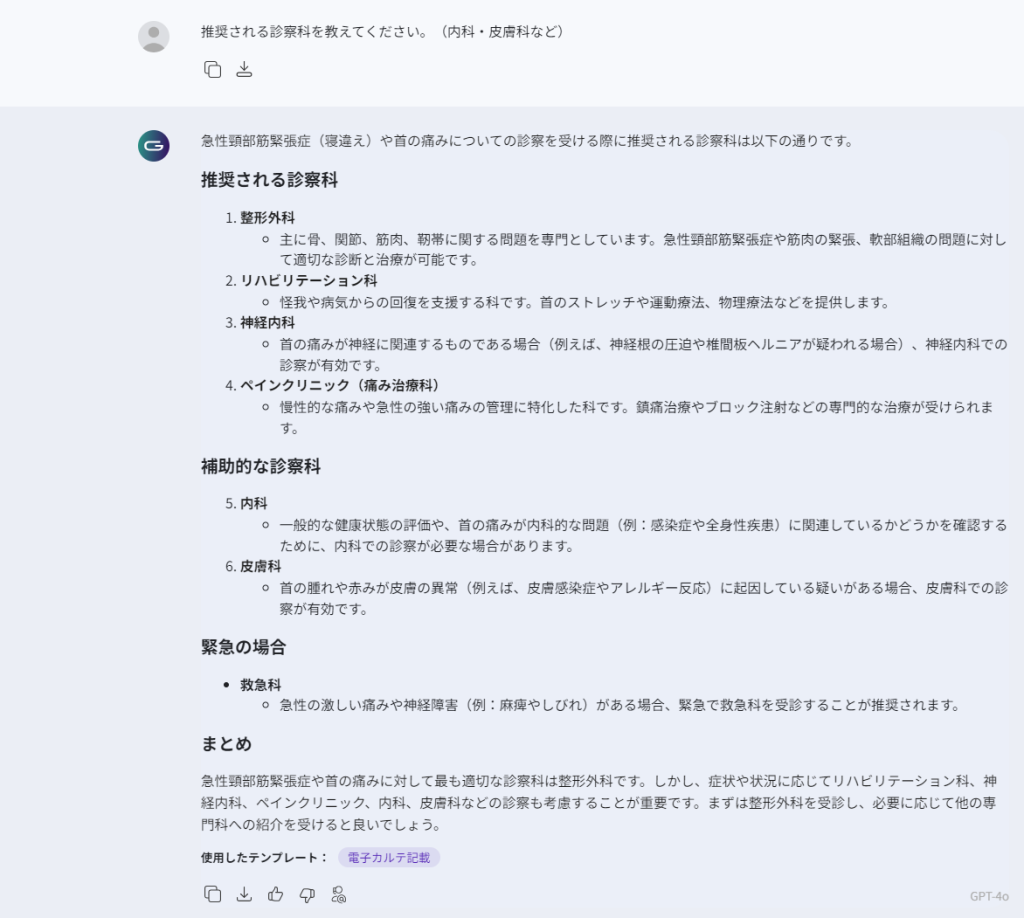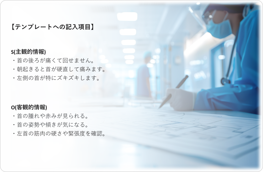 電子カルテ記載」テンプレートでは、医師や看護師が患者の診察結果を詳細に記録する手助けを行ってくれます。