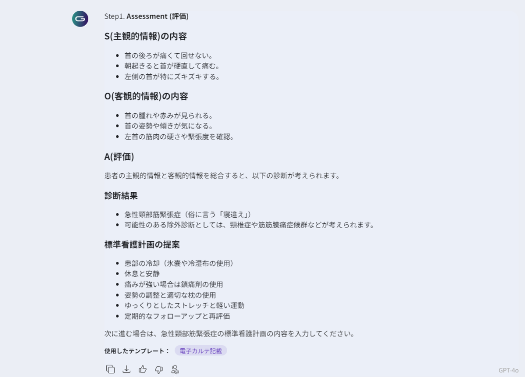 電子カルテ記載」テンプレートを使用することで、診療記録の質と効率が向上し、医療従事者の業務負担が軽減されます。また、診断結果に基づく標準看護計画の提案が行われるため、患者ケアの質が向上します。