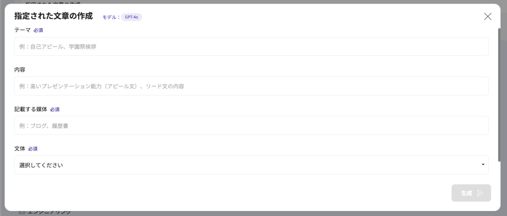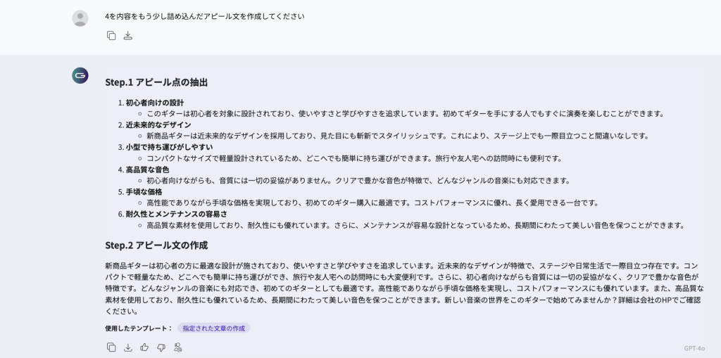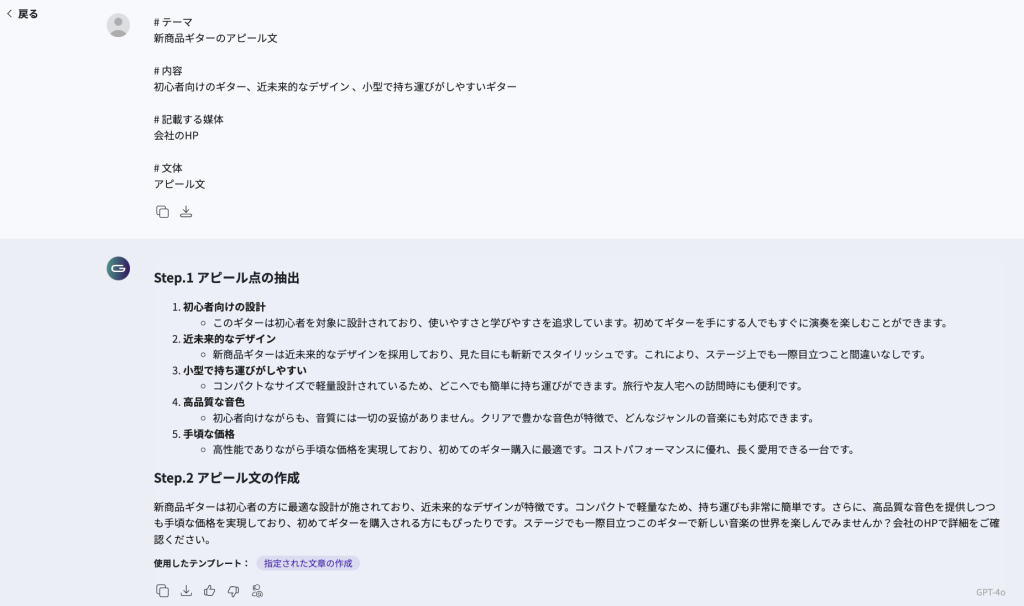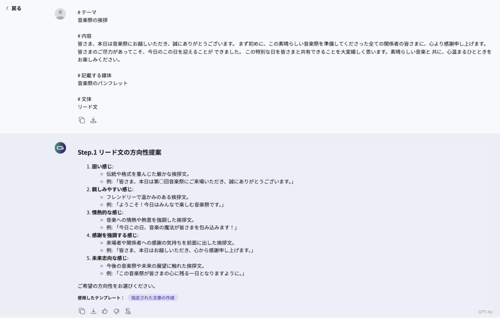 指定された文章の作成」テンプレートでは、指定したテーマや内容に沿った形で「リード文」もしくは「アピール文」を提案してくれます。