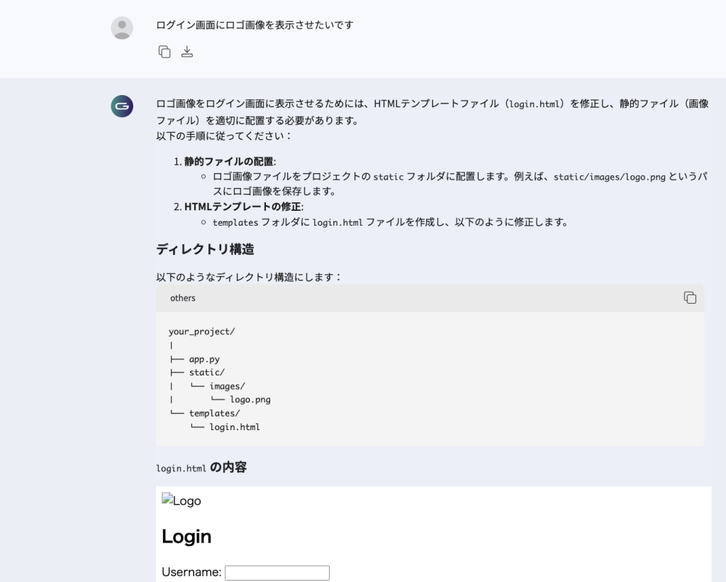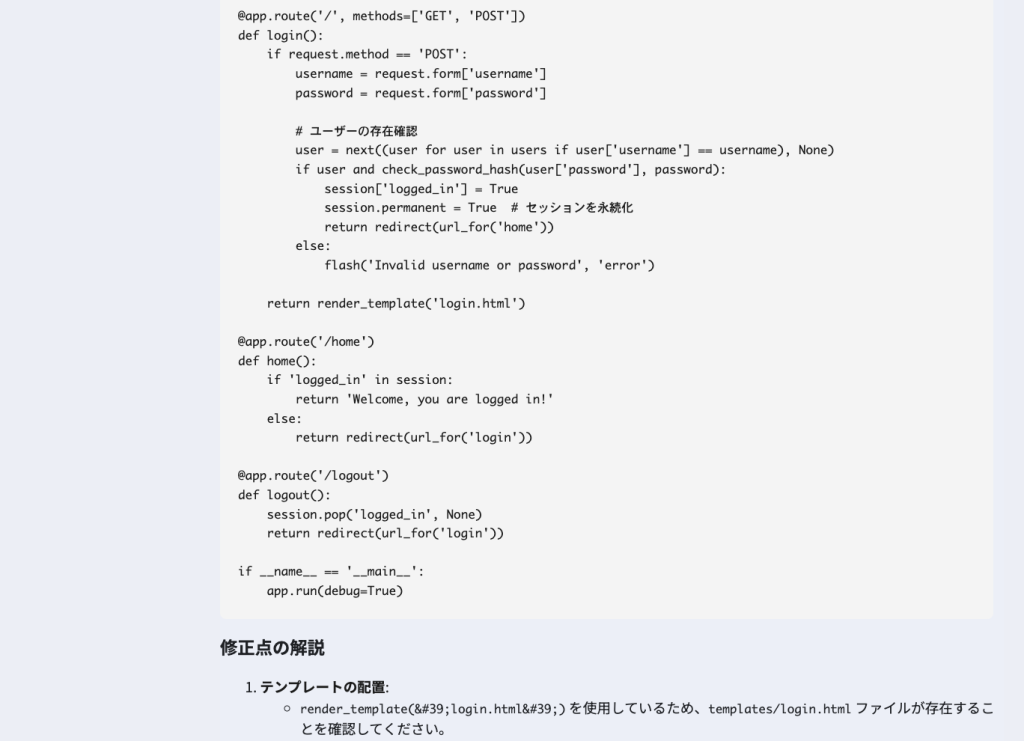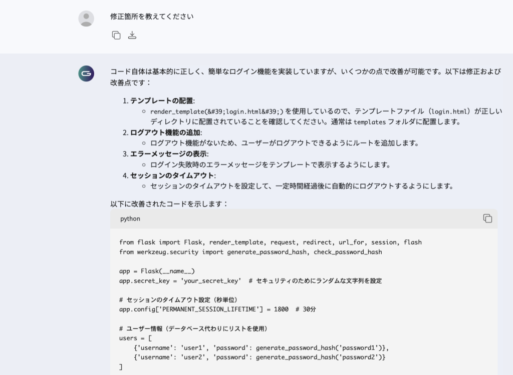試しにこのように入力しましたが、入力したコードに基づいた追加や変更箇所の提案を出力をしてくれました。