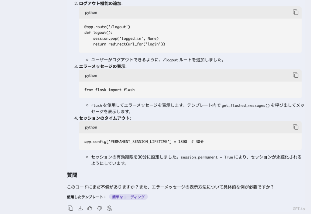 「簡単なコーディング」を行うテンプレートでは、コーディングに関する具体的な要求を入力することで、指定されたプログラミング言語で適切なコードを生成してくれます。
