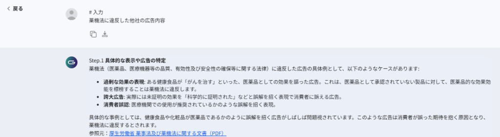 「Step.1」で薬機法に違反した具体的な表示や広告の事例を出力します。