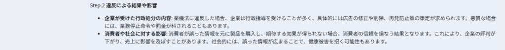 「Step.2」では違反による「企業が受けた行政処分の内容」や「消費者や社会に対する影響」が出力されます。