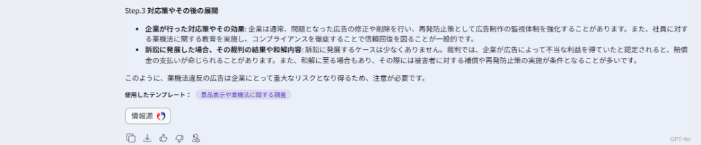 「景品表示や薬機法に関する調査」を行うテンプレートでは、過去の広告や表示がどのように問題視されたのかを、具体的な事例と共にStep-by-step形式で紹介してくれます。さらに、景品表示法や薬機法に違反しないための具体的な提案を行い、広告戦略の見直しに役立てていただけます。これにより、効果的な広告戦略を構築することができます。