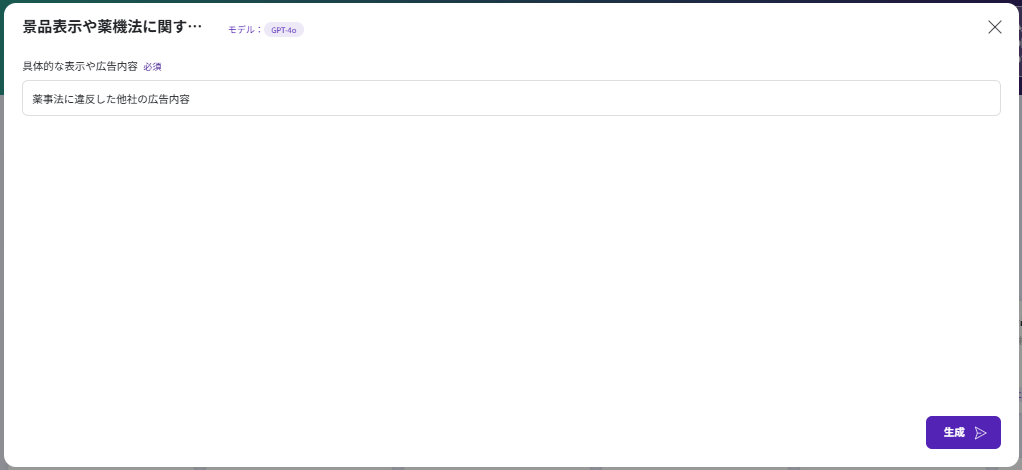 「景品表示や薬機法に関する調査」を行うテンプレートでは、景品表示や薬機法に違反する可能性がある表現や事例を出力します。