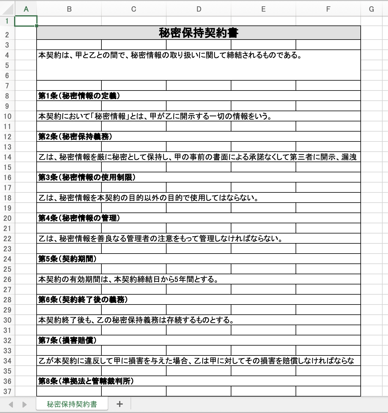 例えば、フォーマットに記載されている「第5条(契約期間)」と「甲」の箇所を変更したい場合、