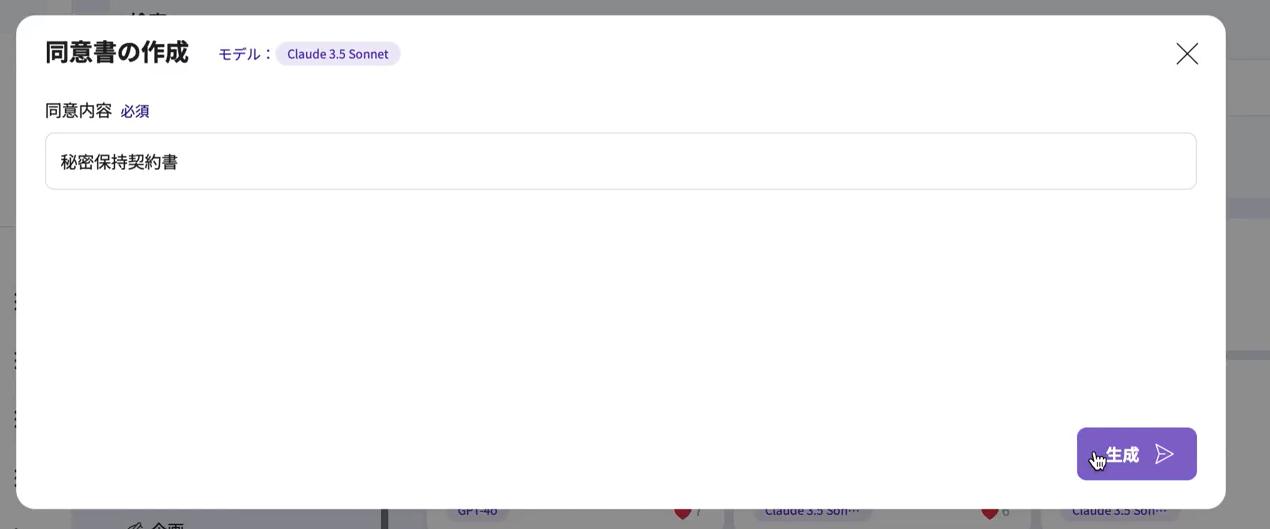 「同意書の作成」を行うテンプレートでは、同意書や契約書の種類を入力することで自動的に