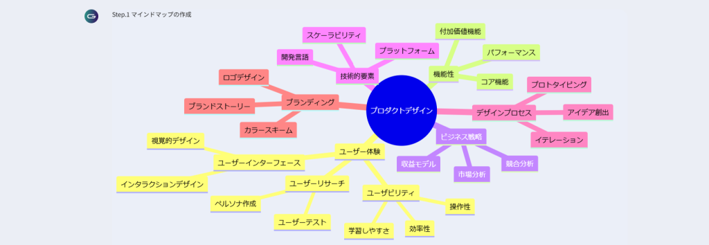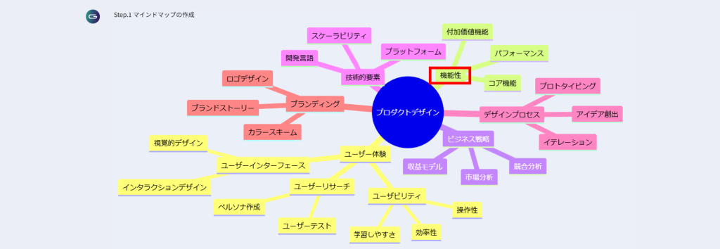 - 「Step.1 マインドマップの作成」:マインドマップに表示される各項目