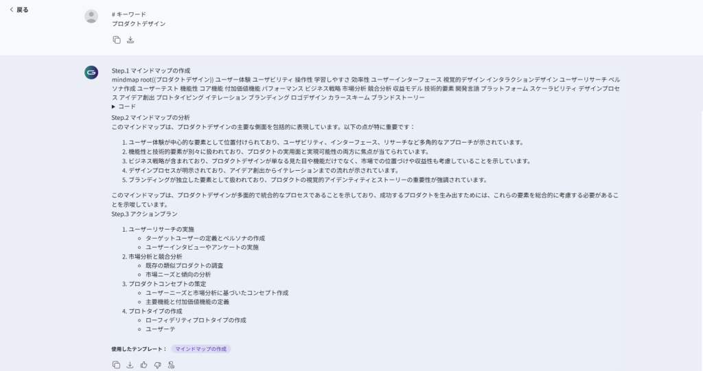 最初に、入力したキーワードをもとに以下の内容が出力されます。