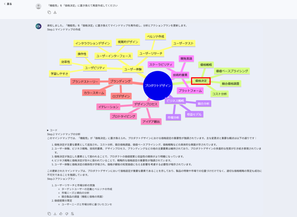 試しに、「機能性」の項目を「価格決定」に置き換えて生成させてみます。