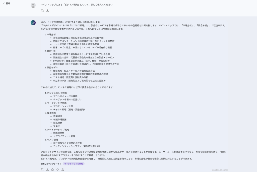 試しに、先ほど作成されたマインドマップ内にある「ビジネス戦略」という項目で生成を行ったところ、以下のように枝分かれした項目の詳細と含まれる要素が出力されました。