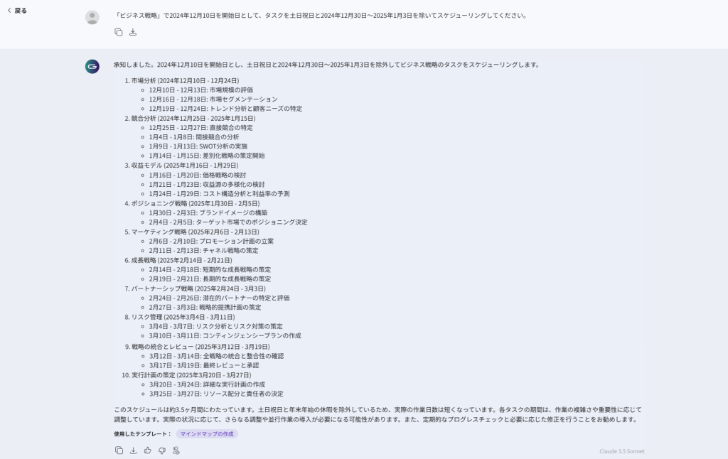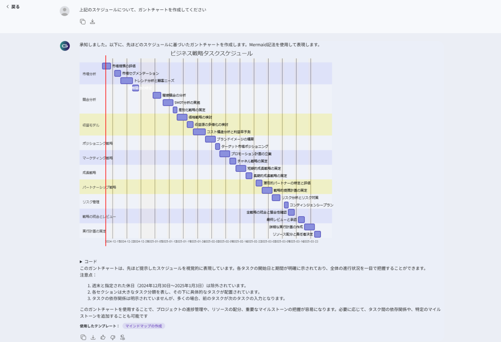 こちらも「ビジネス戦略」の項目で生成を試したところ、以下のようにタスクスケジュールが出力されました。