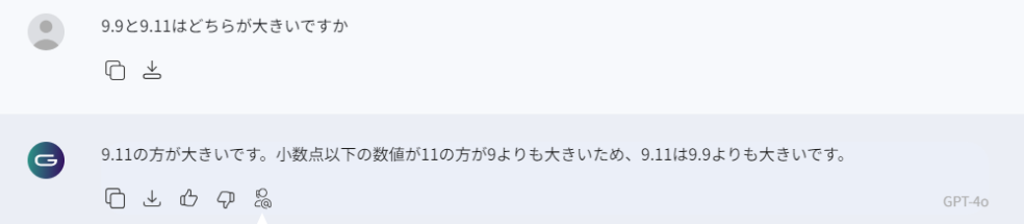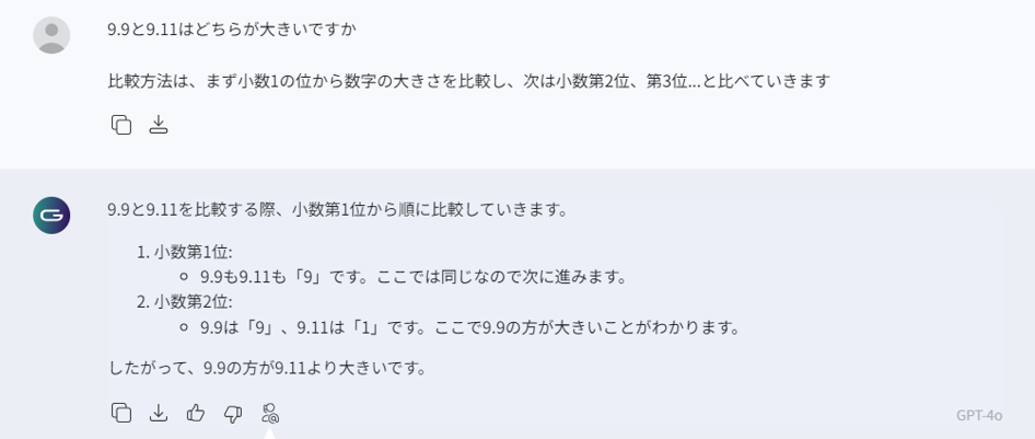 この場合は、AIが数学としてではなく数字羅列として認識してしまい、誤った回答が生成されました。
