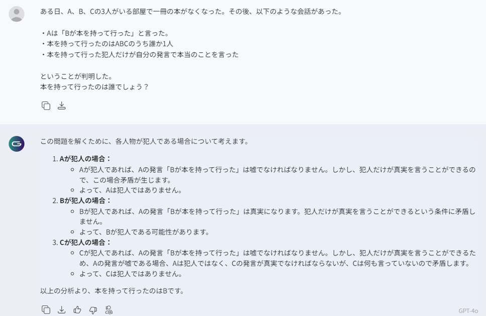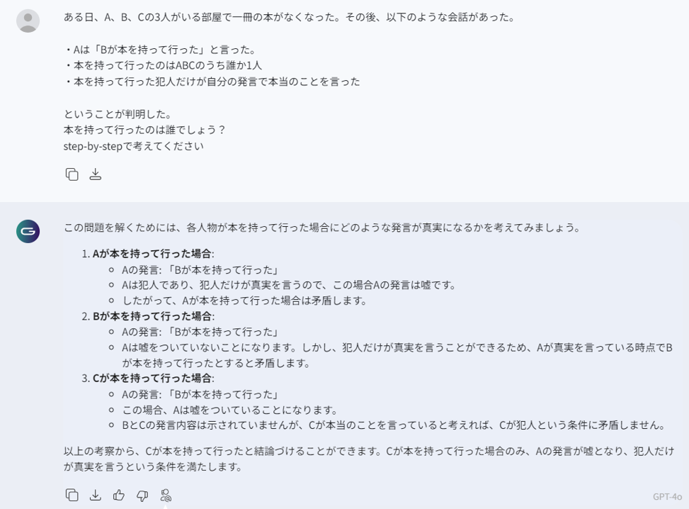 対策として、「step-by-stepで考えてください」 という一文を入力することで順を追って思考が働き、