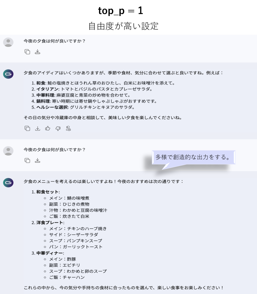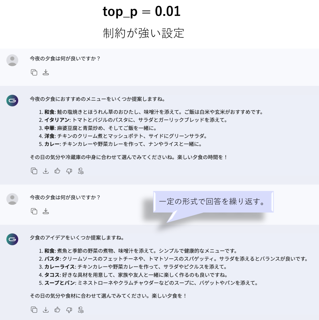 ・値が0.01だと上位1%、1.0だと全てのトークンを対象に回答を生成する