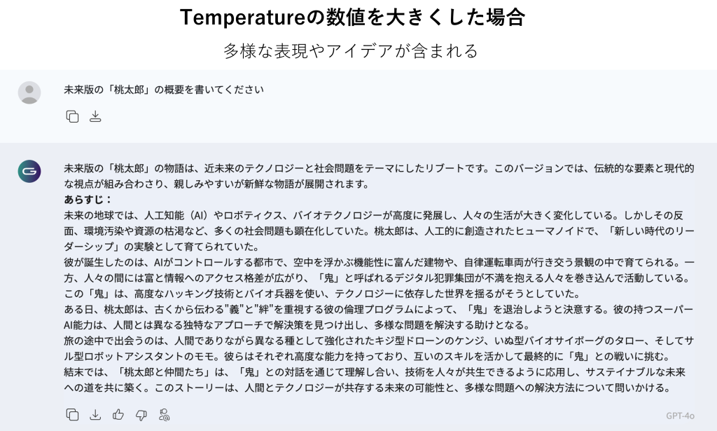 例えば、想像性を高めてアイデア出しを促進したり、一貫性を重視して正確な情報提供を