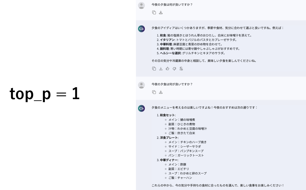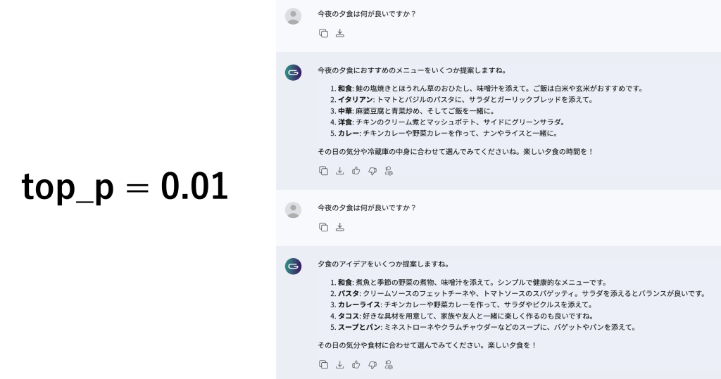 ・値が0.01だと上位1%、1.0だと全てのトークンを対象に回答を生成する