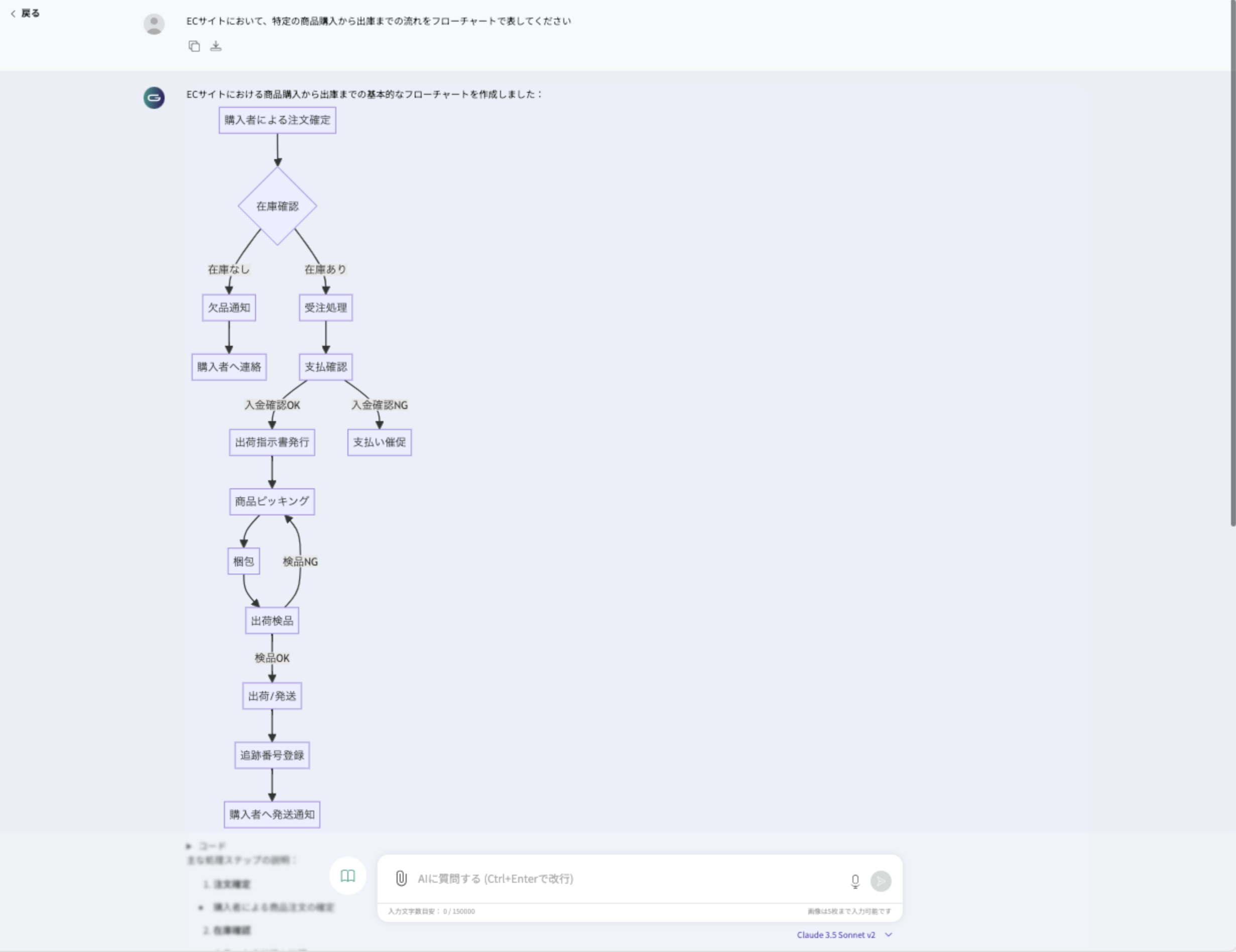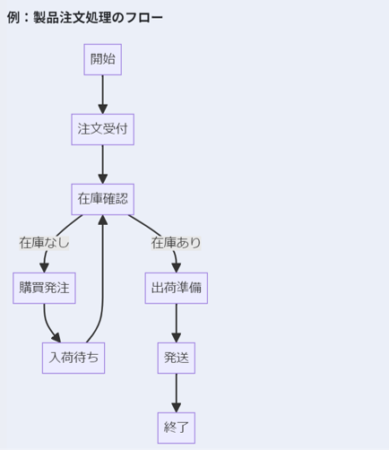 例:ECサイトにおいて、特定の商品購入から出庫までの流れをフローチャートで表してください