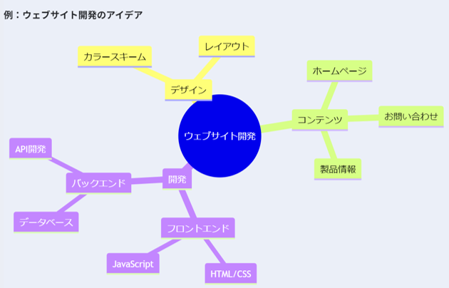 中心となるテーマから関連するアイデアや情報を放射状に展開した図です。