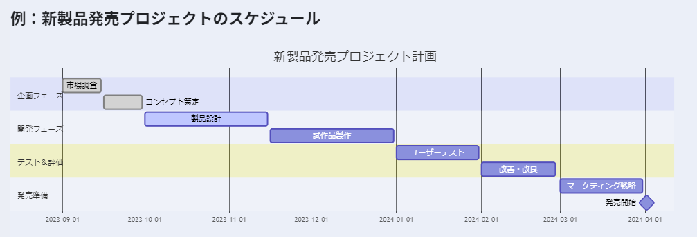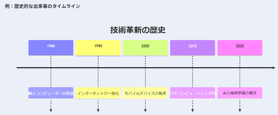 時系列に沿った出来事やプロジェクトの重要なマイルストーンを示す図です。
