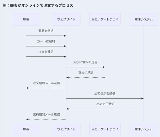 オブジェクト間の相互作用やメッセージのやり取りを時系列で表現します。