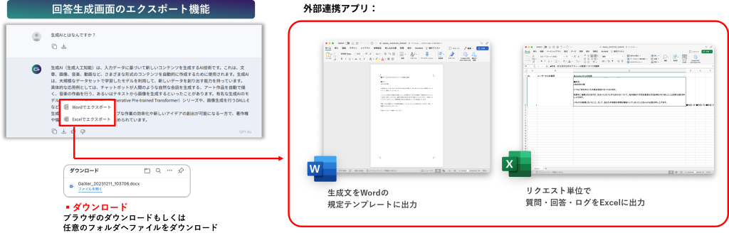 生成した文章は、UI上のコピーボタンを通じて、メール、文書画面、パワーポイント等、様々なテキスト入力エリアにペーストができます。また、.docx、.xlsxなど、UI上の「エクスポート」ボタンを押下して、直接文章として出力し、質問文と回答が応対する形でダウンロードができます。
