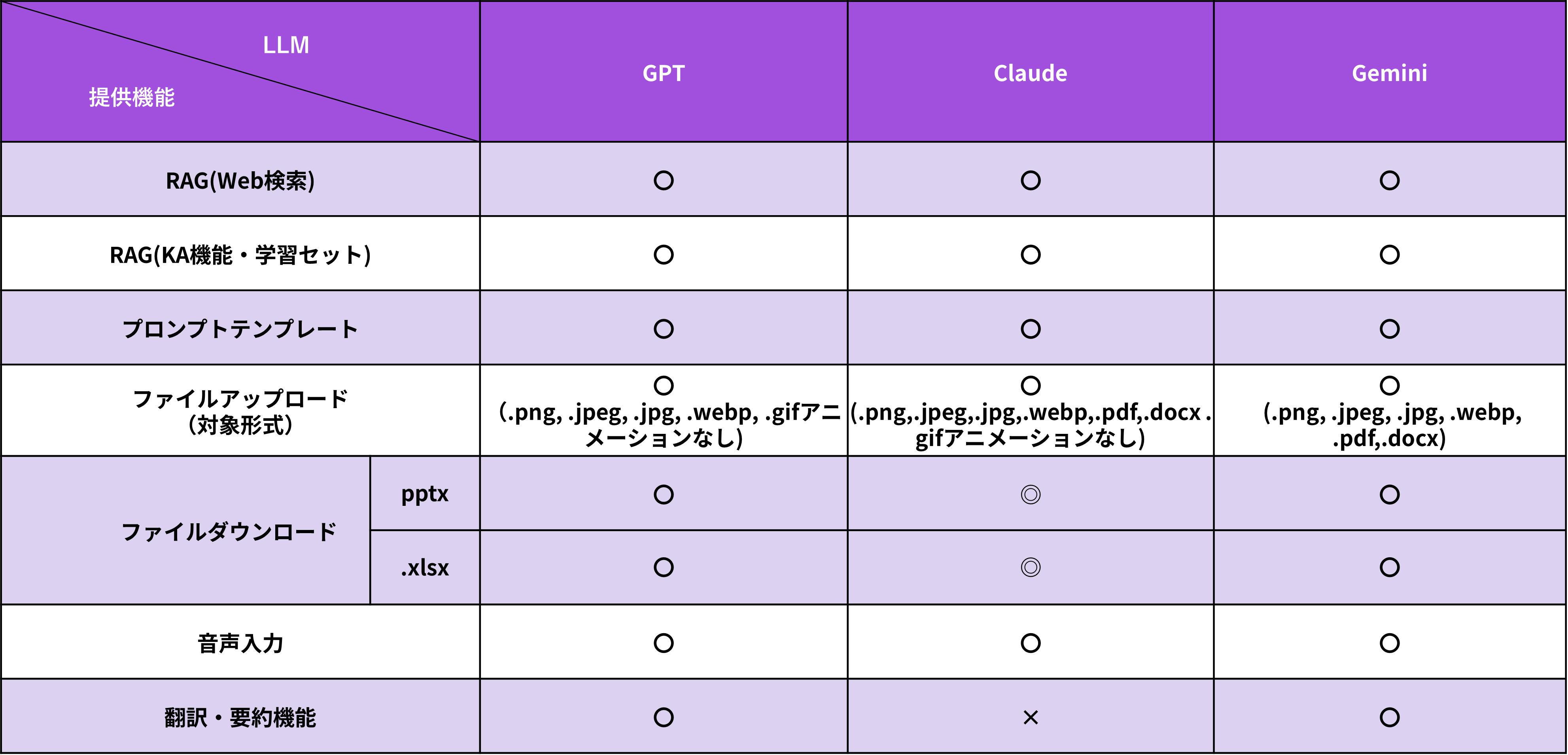LLMによって提供機能が異なりますので、詳細は下記の表をご参照ください。