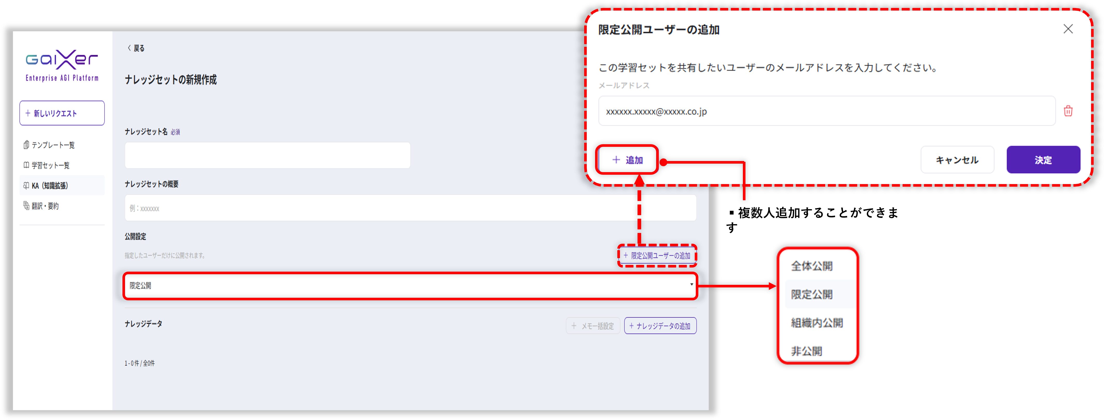 作成したナレッジセットについて、対象ユーザーのメールアドレスを登録することで、対象ユーザーに限定してナレッジセットを公開することができます。