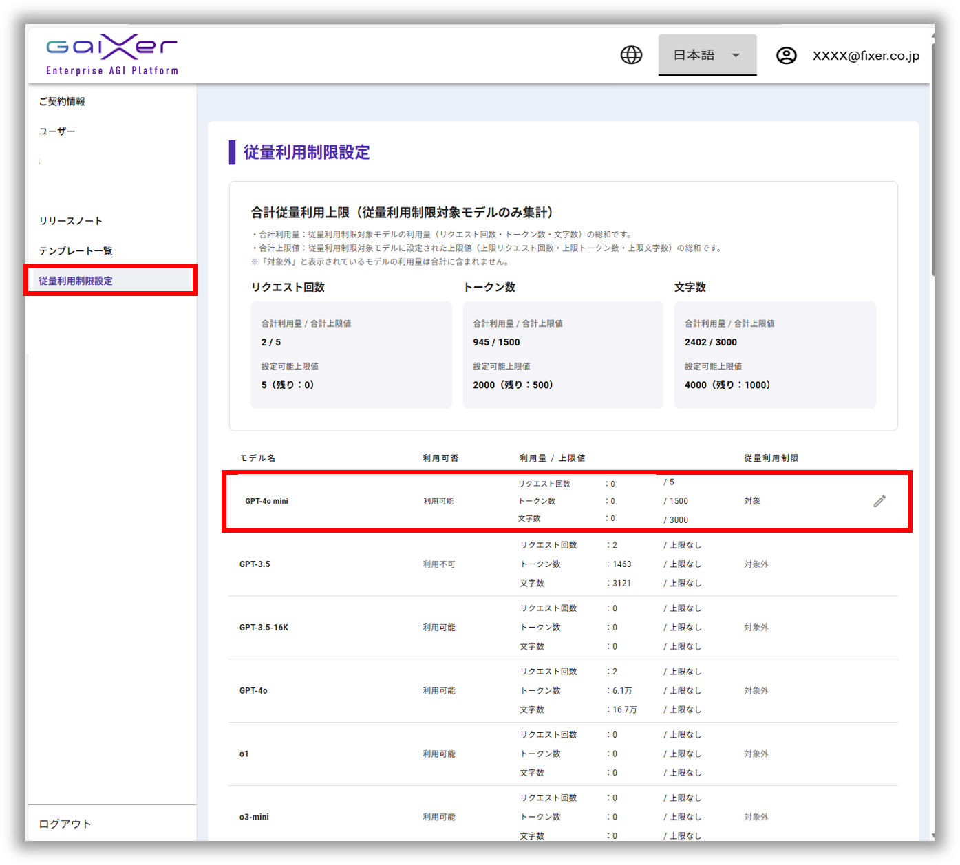 GaiXer Admin Portal(管理者様用ページ)より、LLMごとに従量利用制限を設定可能となります。