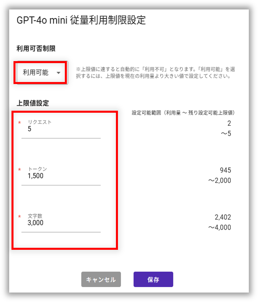 上限値を設定できる項目は、リクエスト回数、トークン数、文字数の3項目です。