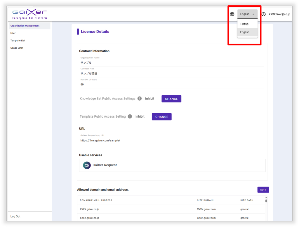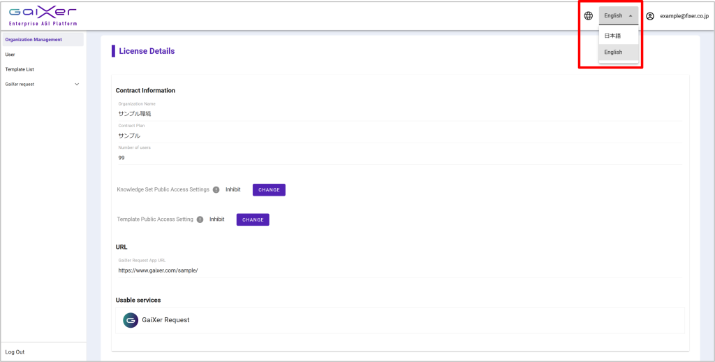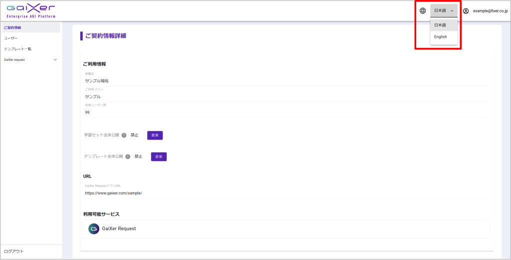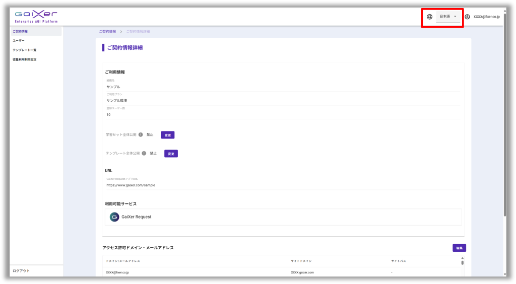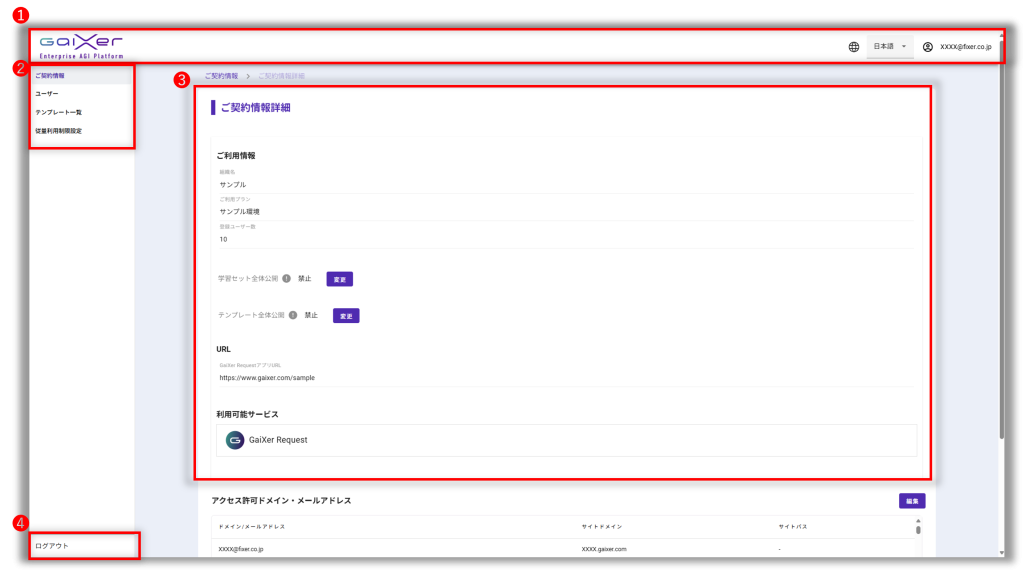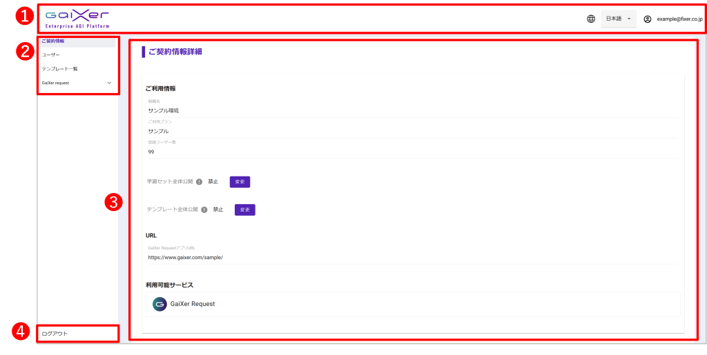 画面説明 ヘッダー:表示言語やログインしているユーザーが表示されます。 管理メニュー:各管理メニューを表示しているエリアです。 ご契約情報詳細:確認や操作を行うメインエリアです。 ログアウト:ログアウトができ、Admin Portalログイン画面に推移します。 言語切替:画面表示を日本語/Englishに切り替えることができます。 日本語 English